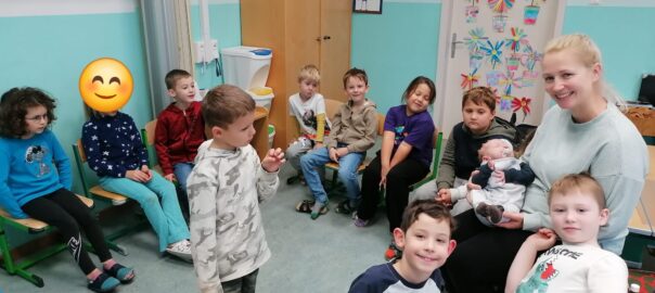 Eine ganz besondere Sachunterrichtsstunde erlebten die Kinder der 1. Schulstufe. Jonathans Mama besuchte mit Baby Paul den Unterricht und erzählte über den Alltag mit einem Baby. Was braucht ein so kleines Kind? Wie muss man ein Baby richtig halten?